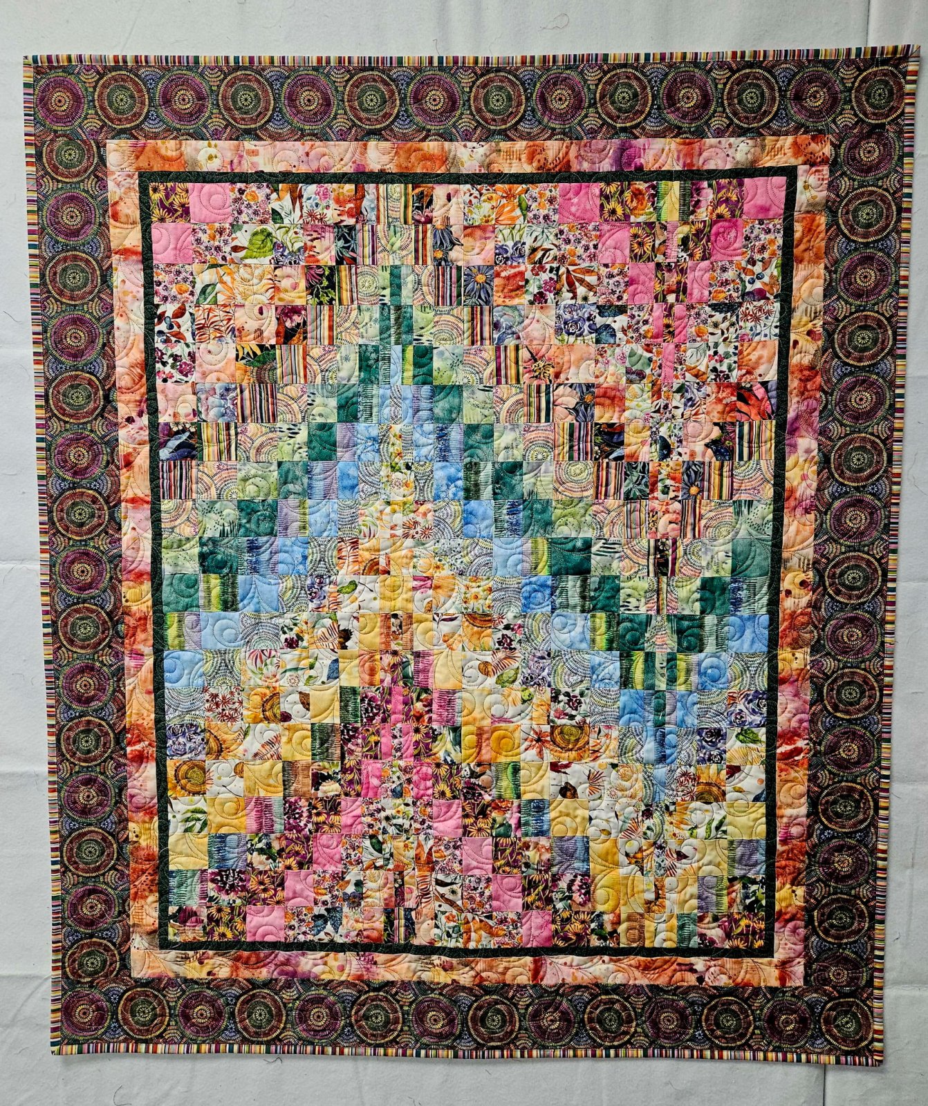 Colors and values need to flow from one to another for the smoothest bargello. Play with your strips before class, and see if you can create this flow. Let’s say that you have a jelly roll that has browns and blues find a more solid blue and a more solid brown, place them about eight inches apart and fill that space with strips that change value and texture, and perhaps have some of both colors. You do not want to group all of your darks together or all of your lights together. Also, there must be enough of a change to be seen ten feet away. You do not want two fabrics that are almost the same to be right next to each other. In this project, that would read as one wide strip instead of two separate ones. One tip: the two ends must also flow together since you will eventually sew your strata into a loop. I would love to see your flow solutions before you sew your strata together. |